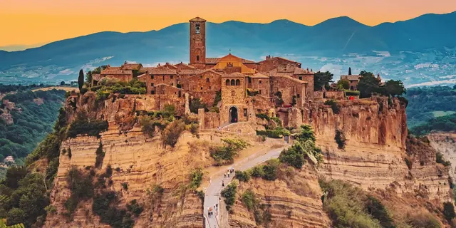 Чивита ди Баньореджо (на главном фото) — небольшой город, расположенный в провинции Витербо в Центральной Италии. Он расположен на вершине холма, окружённого крутыми скалами, и добраться до него можно только по пешеходному мосту. Чивита ди Баньореджо известен как "умирающий город" из-за оттока населения, вызванного его расположением на разрушающейся эрозией скале. Он славится своим неповторимым шармом, живописными видами и очаровательной средневековой архитектурой.