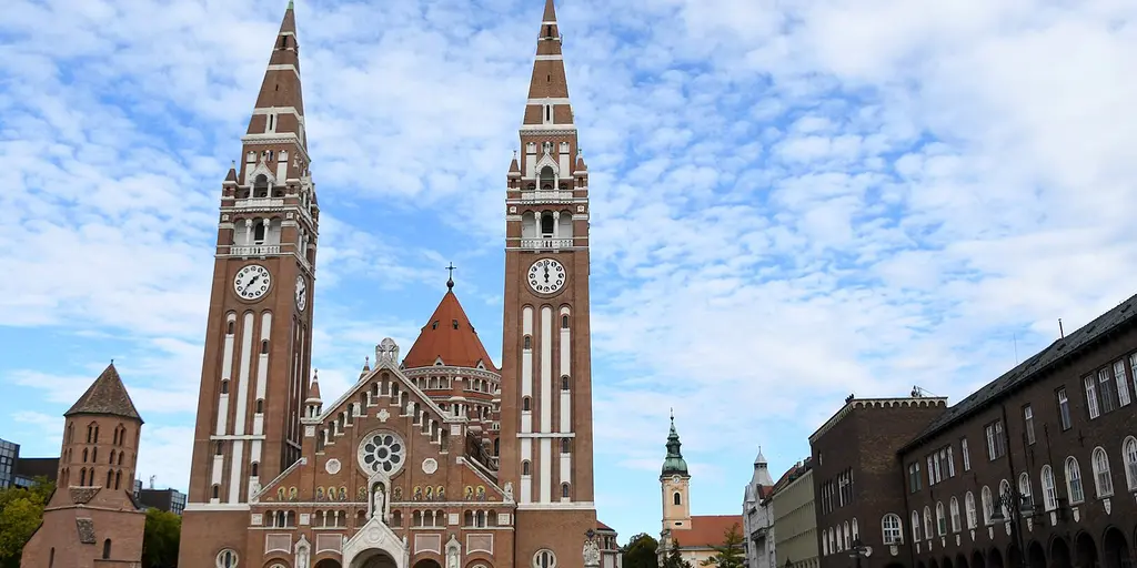 Кафедральный собор - одна из визитных карточек Сегеда. Это красивый собор 30-х годов 20 века, построенный из красного кирпича в стиле эклектики. В архитектуре собора смешались романские, готические и византийские мотивы. Это четвертая по величине церковь Венгрии. Также здесь расположен один из крупнейших органов. Часто ее также называют Вотивная церковь. Рядом расположена башня св. Деметра. Раньше это было колокольня старинного собора 13 века, которую восстановили в форме башни после наводнения в 19 веке.