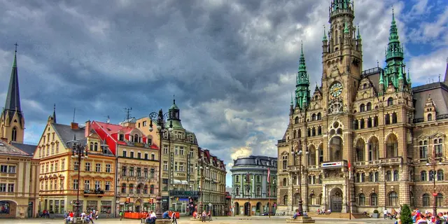На фото представлен исторический центр города Либерец. Справа расположена Либерецкая ратуша - одна из главных достопримечательностей города, построенная в стиле неореннесанс и внесенная в список всемирного наследия ЮНЕСКО.