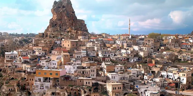 Ортахисар - небольшой очаровательный городок, расположенный в турецкой провинции Невшехир в исторической области Каппадокия. Ортахисар, что в переводе с турецкого означает "Средний замок", назван в честь внушительной скальной крепости, которая является его визитной карточкой. Это поразительное сооружение высечено из естественного скального массива и относится к византийской эпохе. С одной из самых высоких точек Каппадокии открывается захватывающий панорамный вид на окружающие сказочные дымоходы, виноградники и гору Эрджиес вдали.