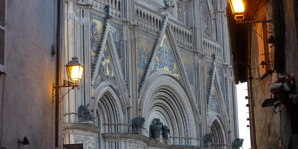 Кафедральный собор в Орвието - одна из самых известных и красивых церквей Италии, настоящий шедевр средневекового искусства. Она построена на самой высокой точке холма и является архитектурной доминантой всего города. Несмотря на довольно сложную историю постройки (церковь начали возводить в 1290 году и строили на протяжении нескольких веков), собор обладает удивительным композиционным единством. По форме здание относится к романскому стилю, но орнамент фасада и художественные ценности внутри выполнены в готическом стиле.