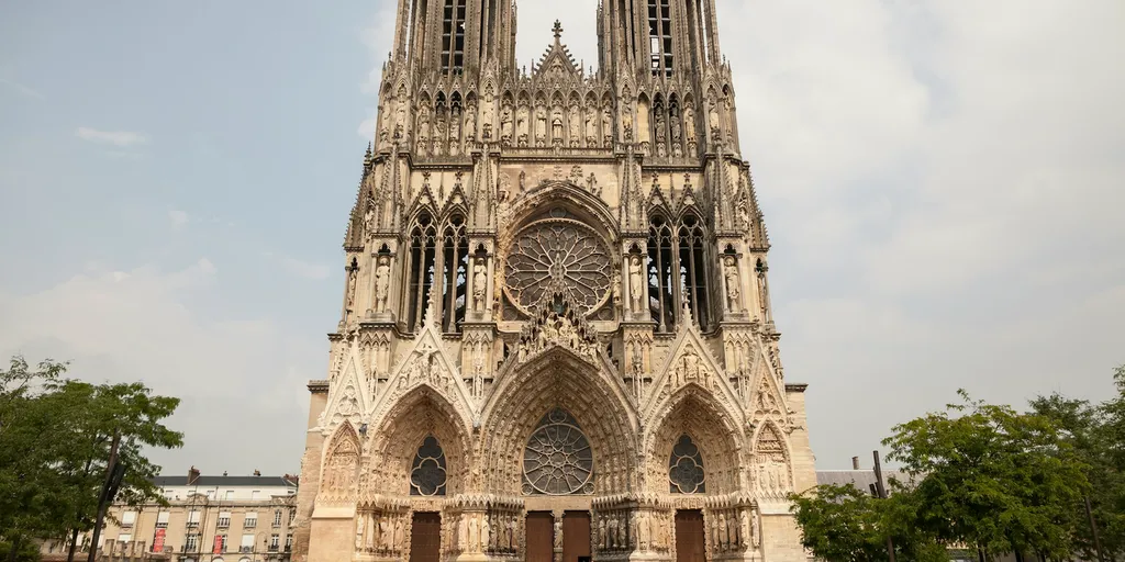 Реймский собор - шедевр готической архитектуры и одна из самых красивых церквей Франции. Современное здание датируется 13 веком и имеет огромный неф, витражи и другие украшения, которые создают атмосферу торжественности. На западной стороне находится три великолепных дверных проёма с большим окном-розой. Над ними расположена культовая "галерея королей" - ряд статуй в нишах.